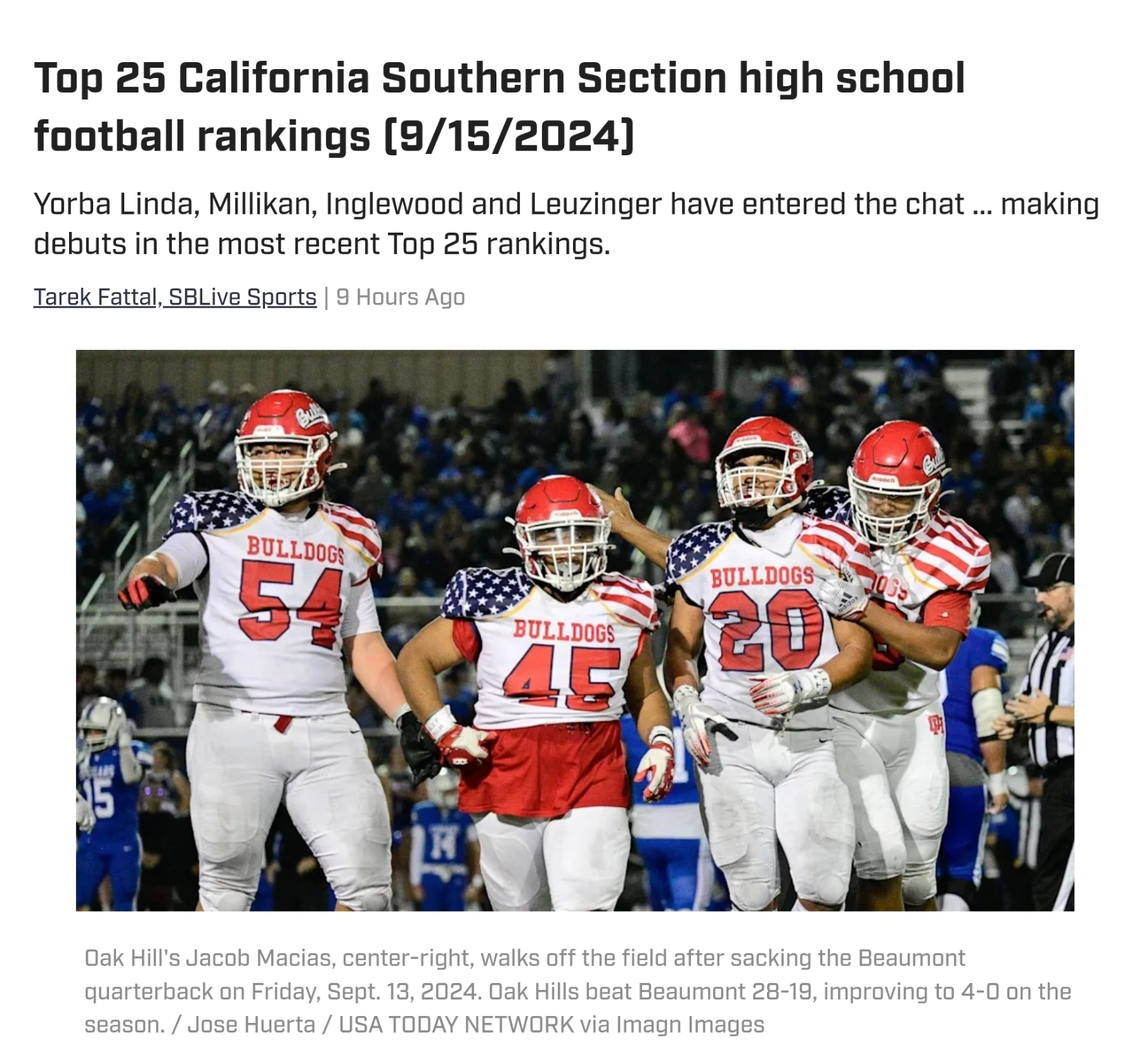 In their next game, the Bulldogs face the St. Bonaventure Seraphs (Ventura, CA) in a non-league challenge, on Friday, September 20. Oak Hills will attempt to improve on its 4-0 season record. The Seraphs go into the challenge with a 3-1 record after their 47-7 non-league loss to Inglewood (Inglewood, CA).